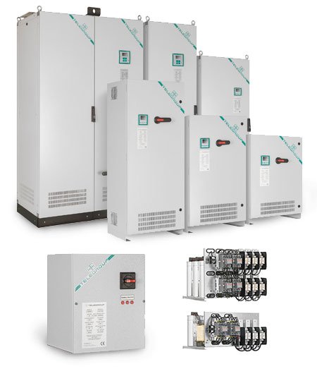 Regulateur à microprocesseur automatique à microprocesseur automatique, Série PCRL, contacteurs tripolaires pour batteries de condensateurs, sectionneur tripolaire avec verrouillage de porte (disjoncteur MCCB ou interrupteur avec fusibles sur demande), fusibles de protection NH pour chaque batterie de condensateurs et, en fonction des puissances, ventilation forcée système.